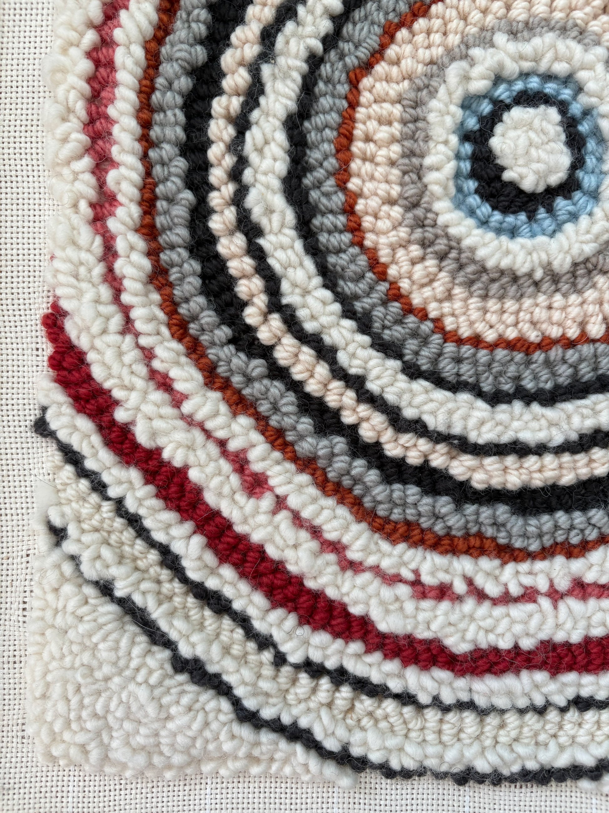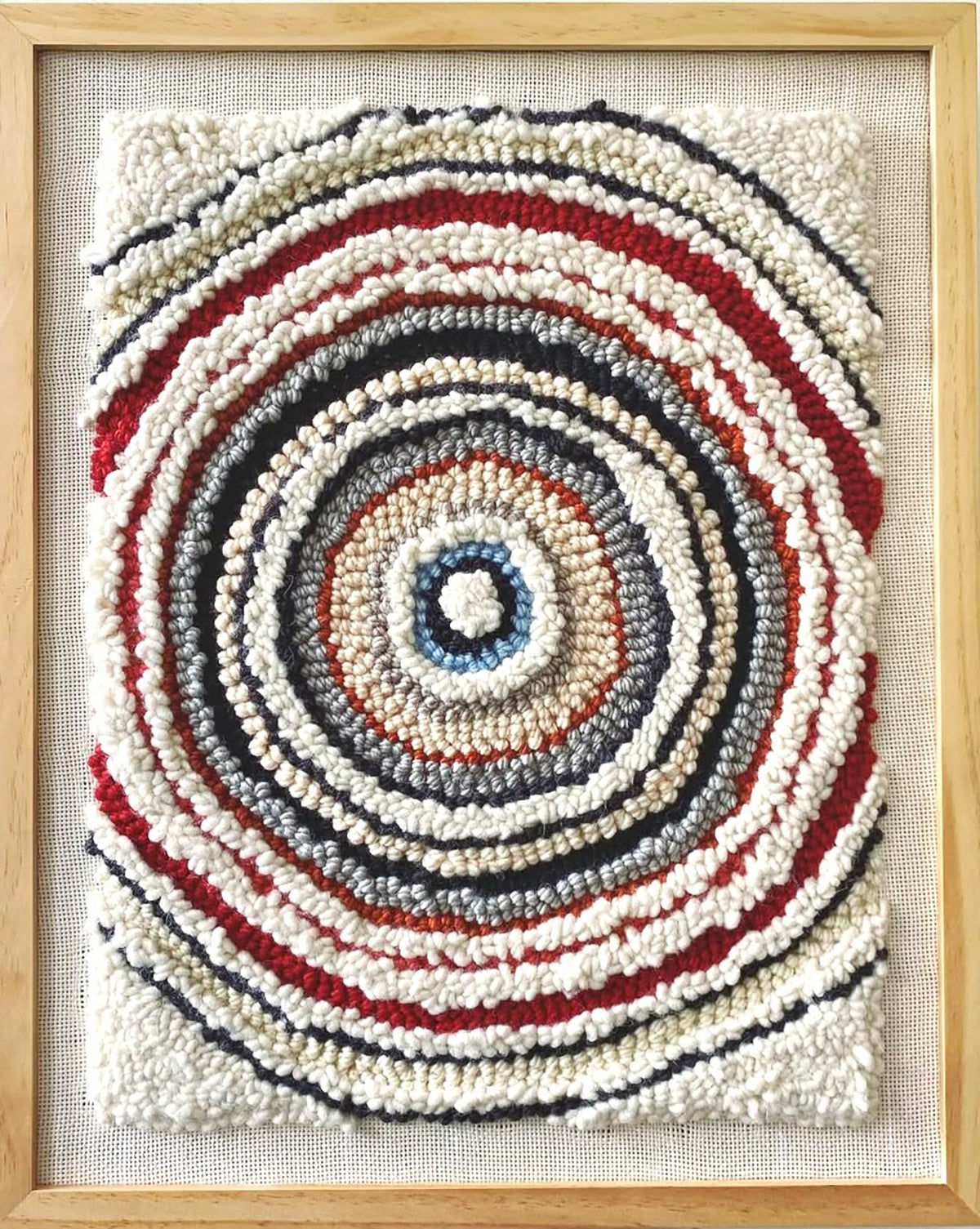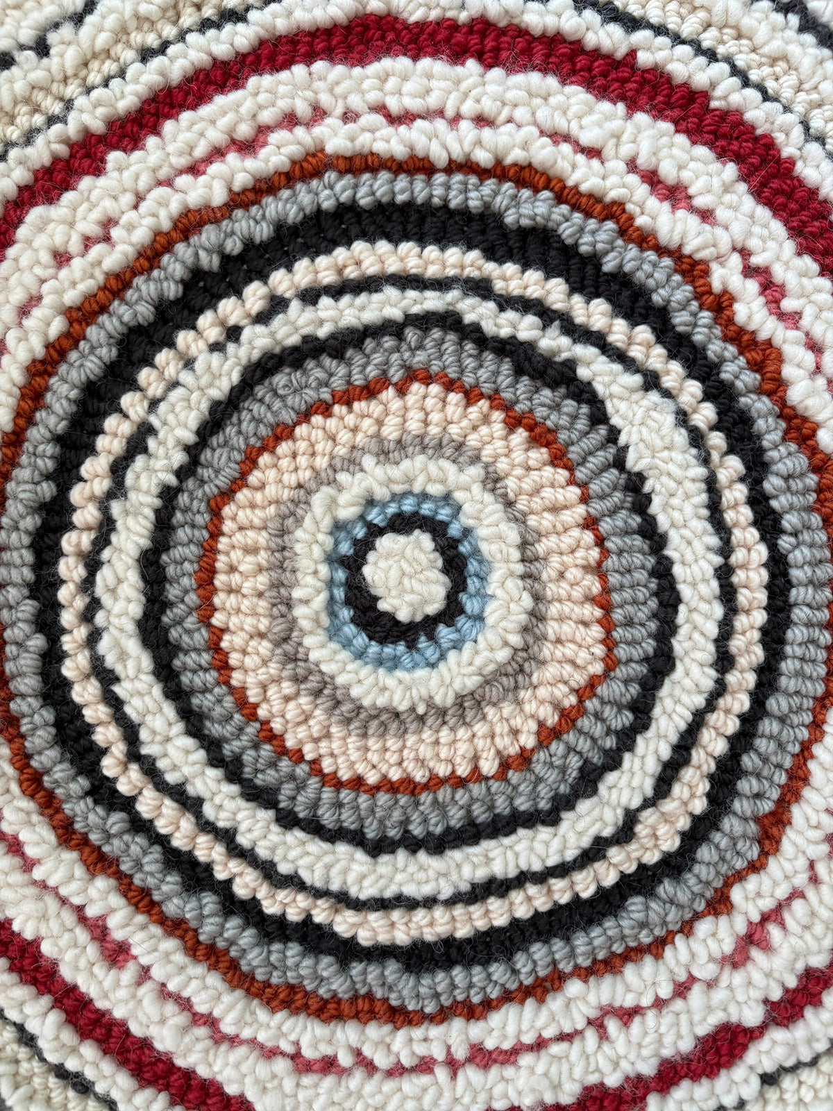 Handmade punch needle artwork featuring a composition of radiating circles in warm, earthy tones. The soft wool texture and layered design create a sense of movement and balance, making this piece a grounding addition to any space. The circles unfold in quiet rhythm, radiating outward echoing the tones of soil, stone, and sun. The soft punch needle surface invites touch, while the composition suggests both movement and stillness—a meditation on balance, cycles, and the grounding beauty of nature.