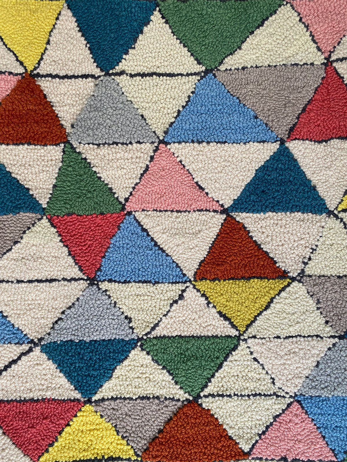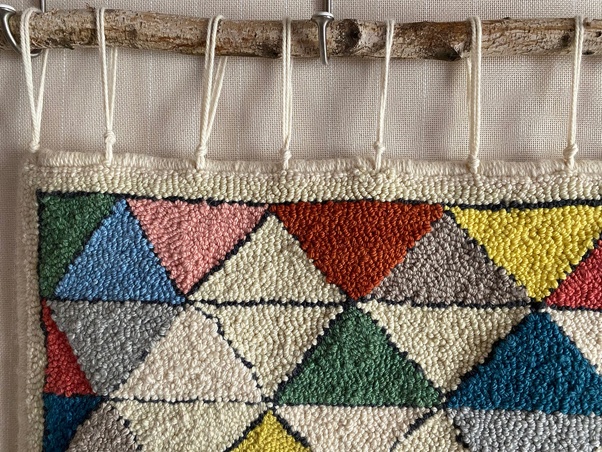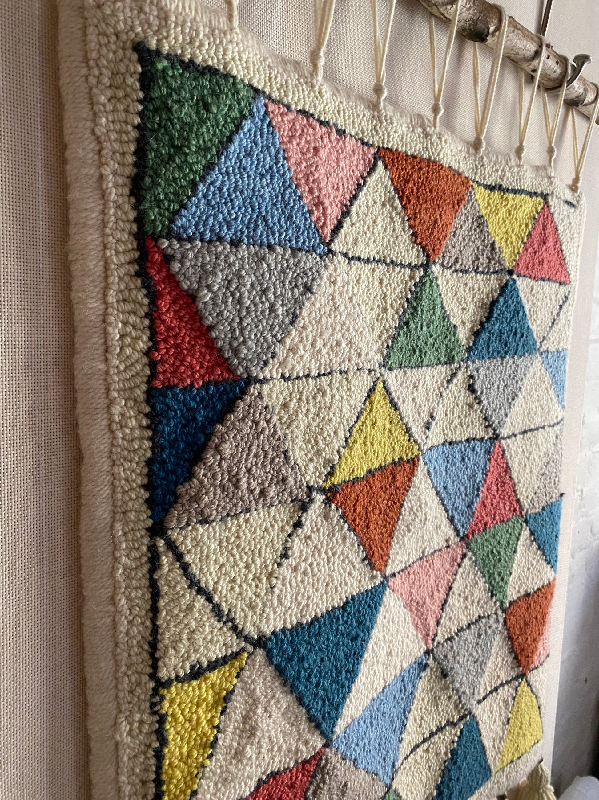 A vibrant punch needle wall hanging bursting with geometric charm. Handcrafted with soft, textured wool, this piece features bold triangular shapes layered in a dynamic, colorful composition. The interplay of crisp angles and plush fibers creates a striking balance between modern design and handmade warmth, making it a perfect statement for any artful home.