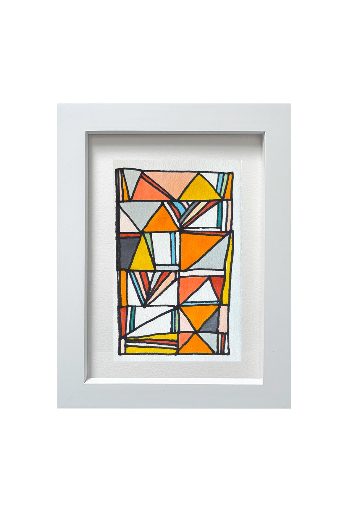 Works on paper Bring bold pops of color and modern charm to your walls with this curated series of original drawings. Each one-of-a-kind artwork is hand-drawn with permanent lightfast illustration pens on acid-free paper, showcasing a dynamic mix of energetic geometric shapes and soft organic lines. These small vibrant pieces are perfect on their own or stunning when grouped to create your own mini gallery wall. Framed in a crisp white 1 5/8“ deep wooden gallery frame, that measure approximately 6 1/4” x 8 1/4”