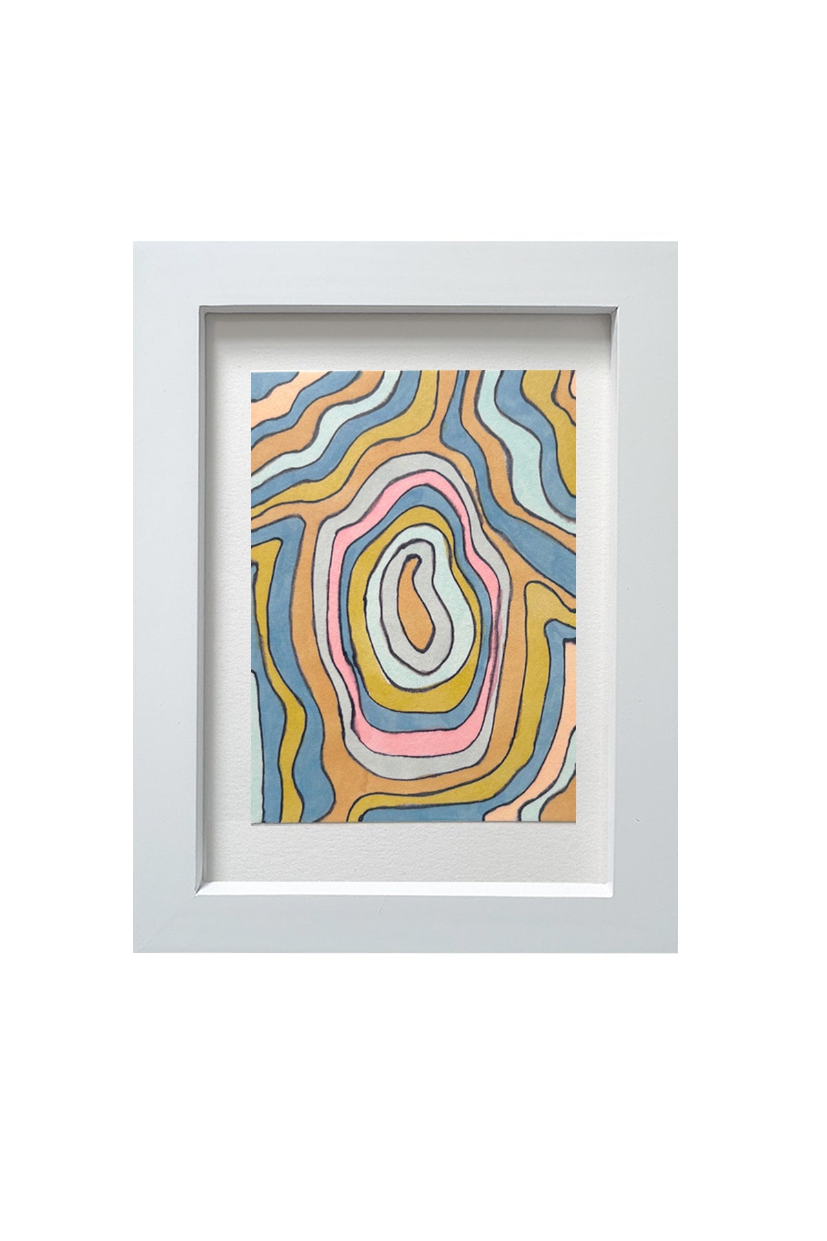 Works on paper Bring bold pops of color and modern charm to your walls with this curated series of original drawings. Each one-of-a-kind artwork is hand-drawn with permanent lightfast illustration pens on acid-free paper, showcasing a dynamic mix of energetic geometric shapes and soft organic lines. These small vibrant pieces are perfect on their own or stunning when grouped to create your own mini gallery wall. Framed in a crisp white 1 5/8“ deep wooden gallery frame, that measure approximately 6 1/4” x 8 1/4”